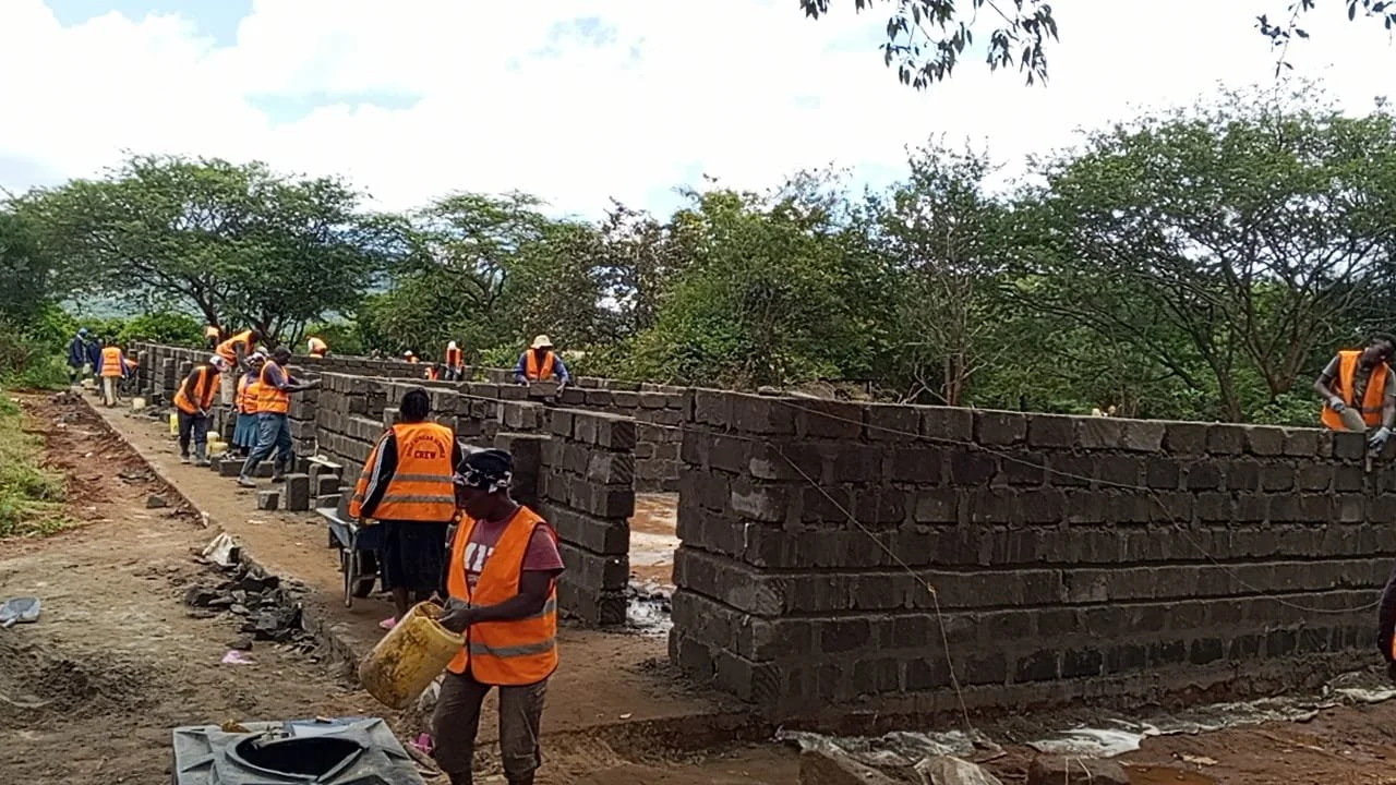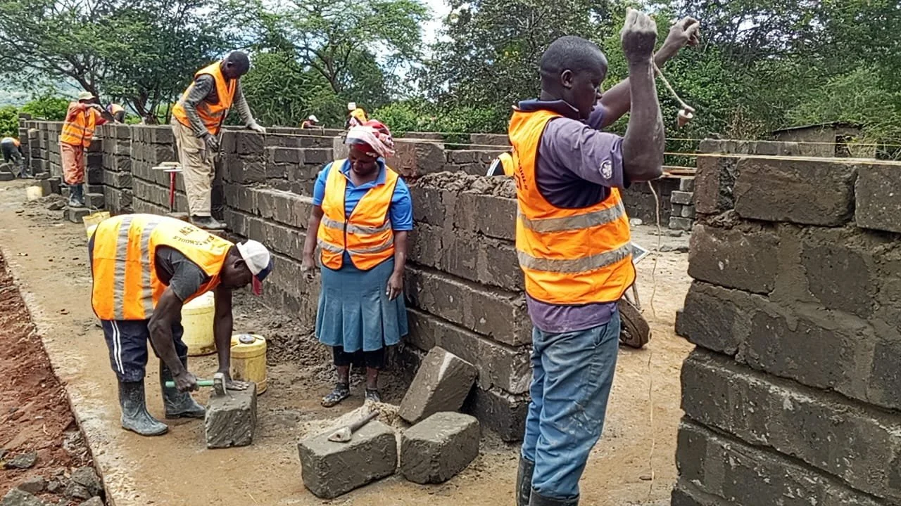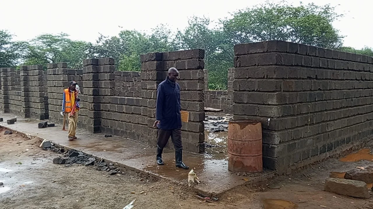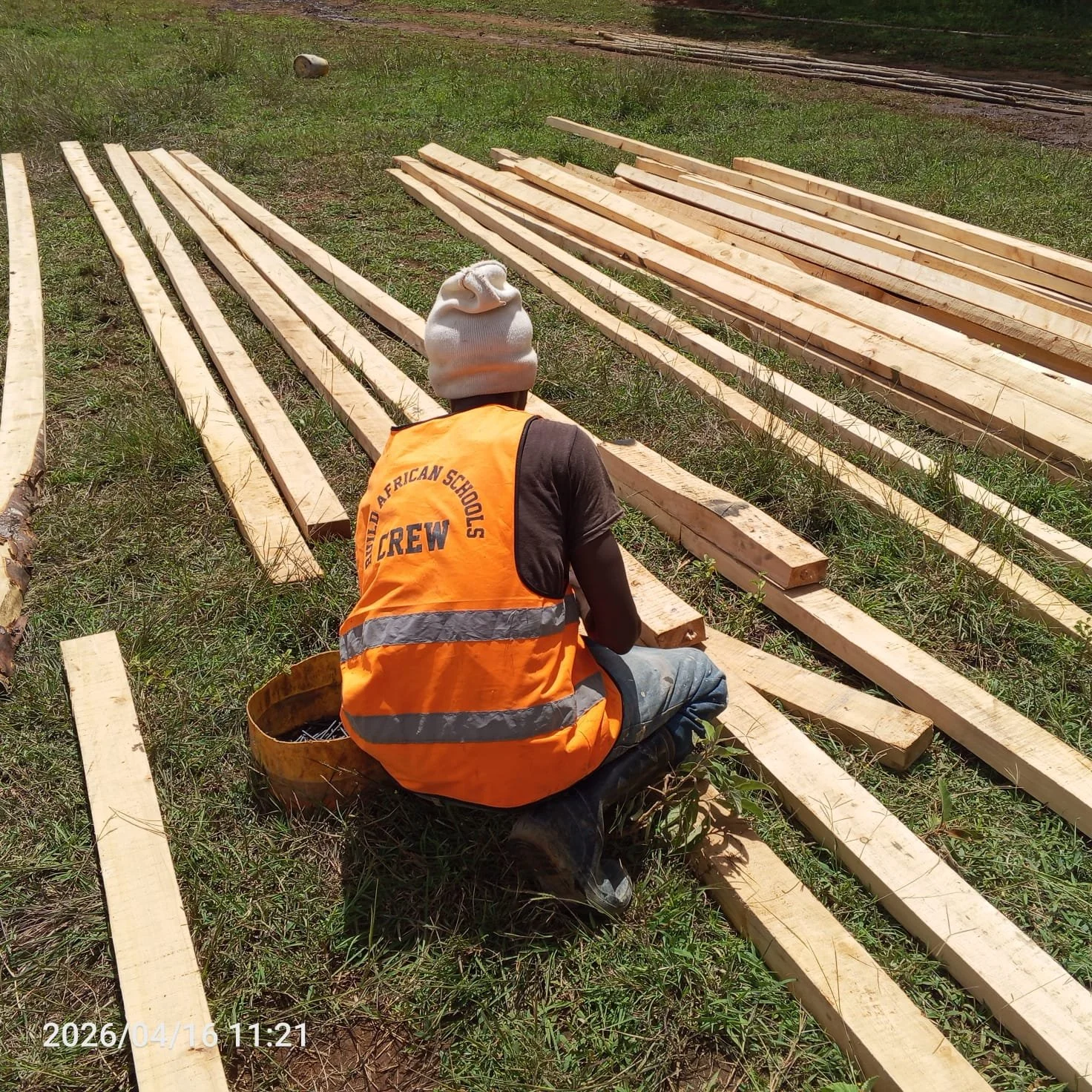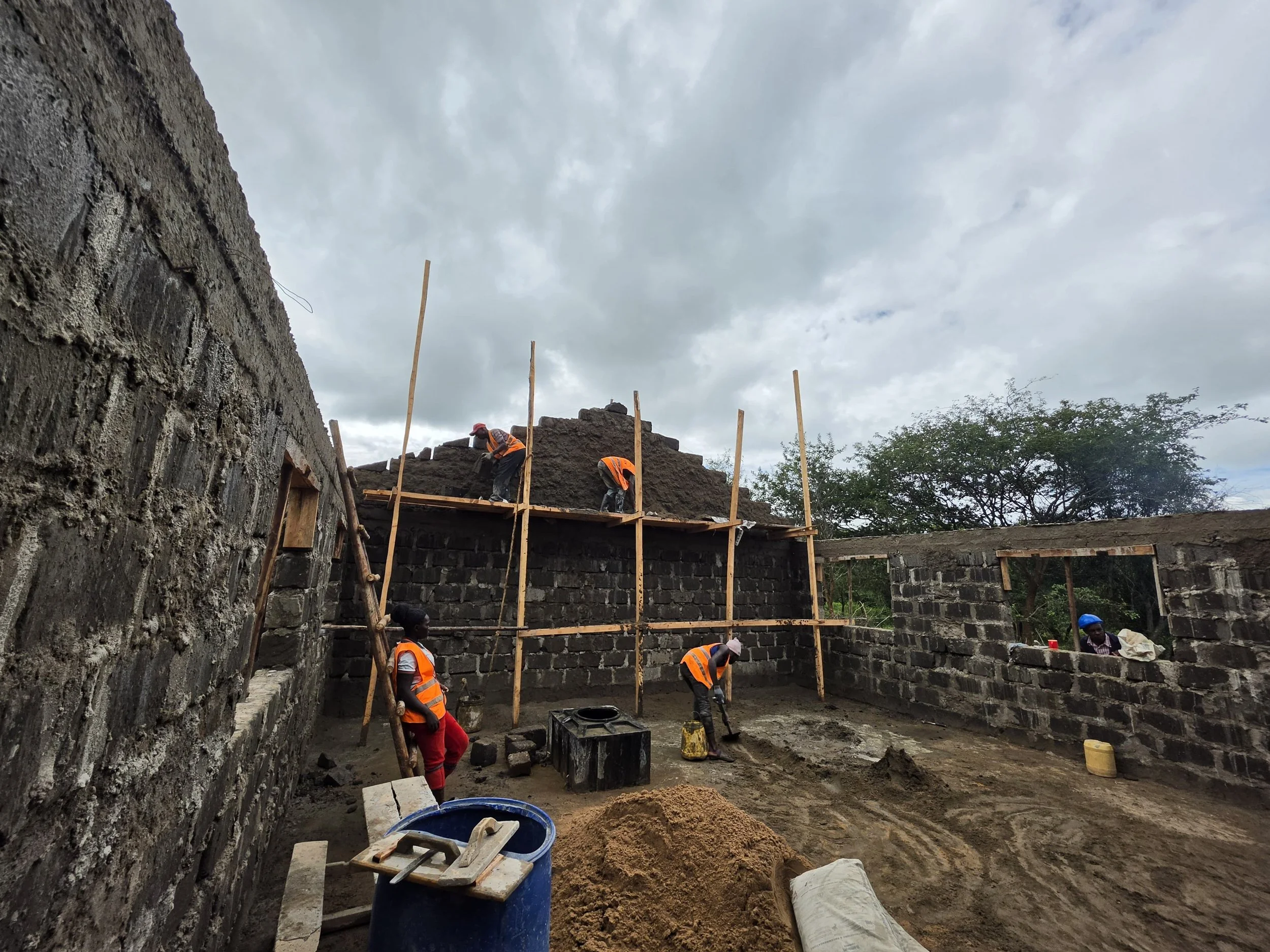 Walls up to roof height. Roofing materials being prepared. Toilet facilities underway. A few days of lost time due to rain but the crew remain undeterred. Tracking to completion target by end of May